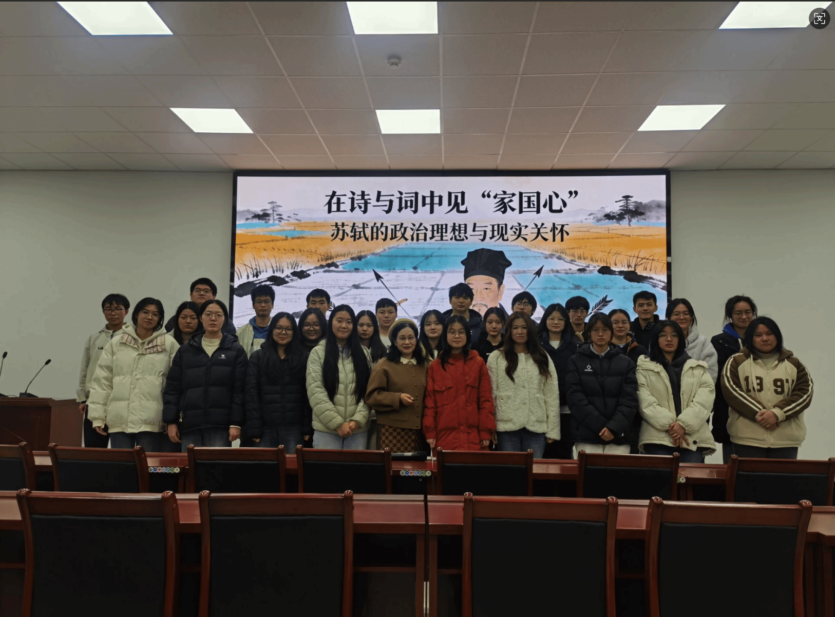 在“苏轼诗词赏析”活动现场,曾莉娟老师以苏轼的人生轨迹为脉络,循着诗人的足迹层层展开:从青年时期“会挽雕弓如满月”的锋芒锐气,到乌台诗案后“拣尽寒枝不肯栖”的沉郁反思;从东坡田埂上“人间有味是清欢”的生活美学,到天涯海角“兹游奇绝冠平生”的晚年豁达。师生逐篇品读《江城子・密州出猎》《卜算子・黄州定慧院寓居作》《六月二十日夜渡海》《定风波》《饮湖上初晴后雨》等经典作品,在平仄声律里触摸千年时光,在词牌诗行中遇见东坡心境。