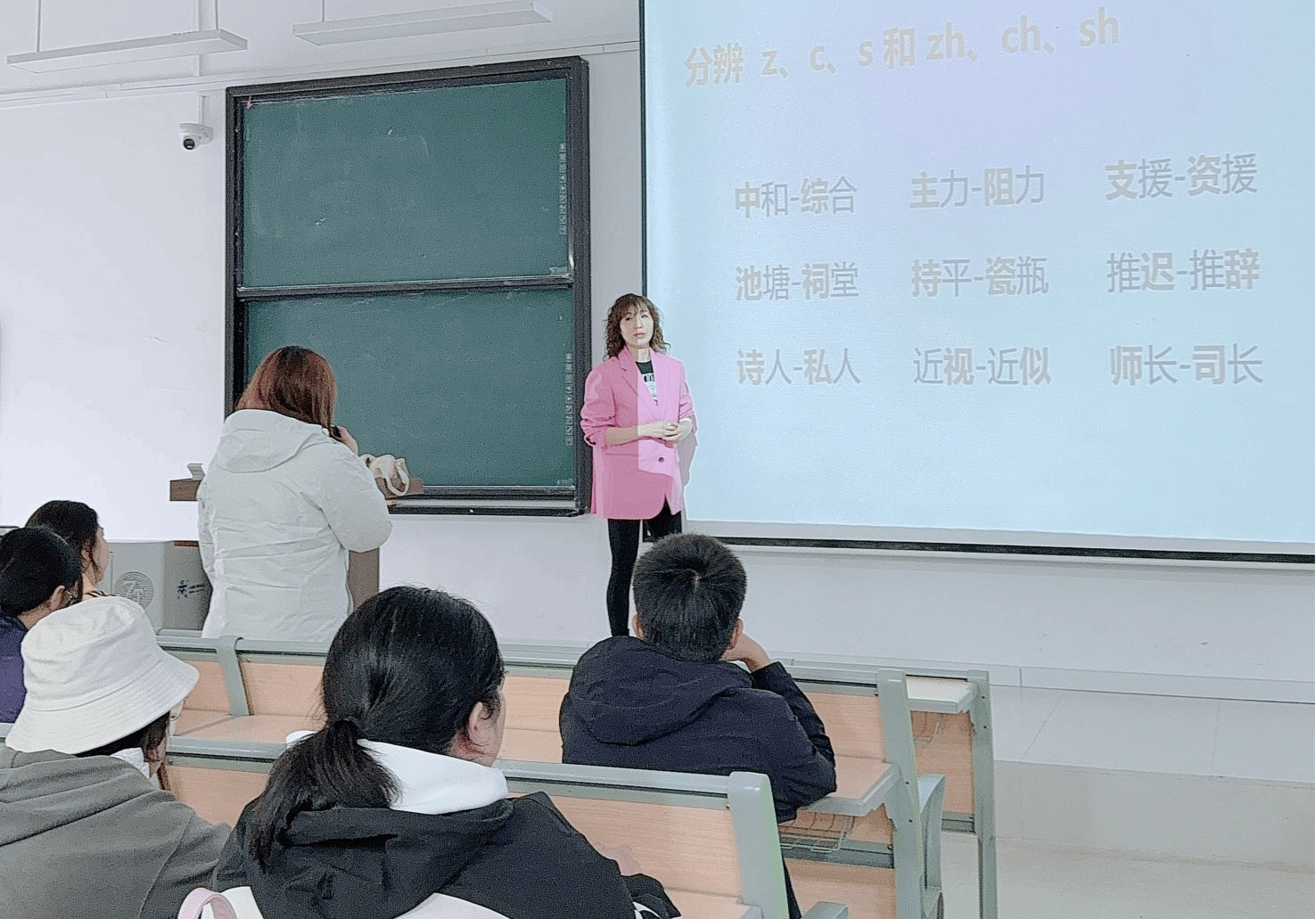 中文教研室6名老师一起出动,两两成组。培训中,老师们先是对考试流程做了清晰的解读,特别提醒考生戴好耳机,做好试音,沉着应试,不必担心时间不够。随后的发声辅导和真题讲解环节,老师们根据现场发言同学的情况,归纳了几个代表性问题,并给了改善方法。尤其是平翘舌混淆、前后鼻音混淆、鼻边音混淆等三大问题,各位老师不仅详细讲解发声技巧,还结合自己的普通话练习经历来鼓励大家,引导大家不要气馁,要放开胆子、多读多说,越说越自信。培训结束时,多名同学到讲台前与老师交流,有同学说,“听完感觉心里有点底了。”